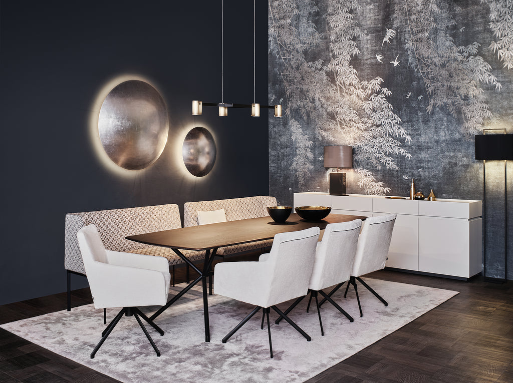 Der industrielle Charme des Möbelstücks TARAS von Christine Kröncke lädt zu unvergesslichen Momenten ein - an Ihrem eigenen Esstisch. Das Design dieses Esstisches lässt genug Platz für jegliche Speisen und Gerichte. Die hochwertige Massivholzplatte ist in einer Bootsform gestaltet und erscheint in geöltem, längsmassivem Nussbaum. Die Platte wird von einem pulverbeschichteten, schwarzen Edelstahlgestell getragen. Das Gestell bildet einen modernen Kontrast zum warmen Holzton der Tischplatte.