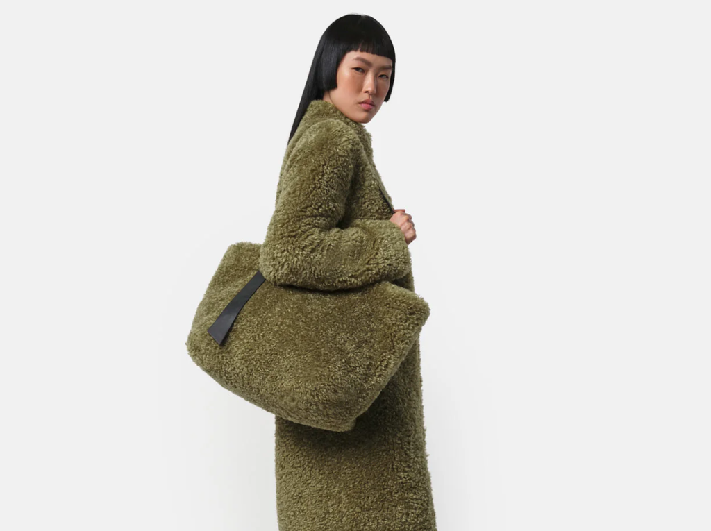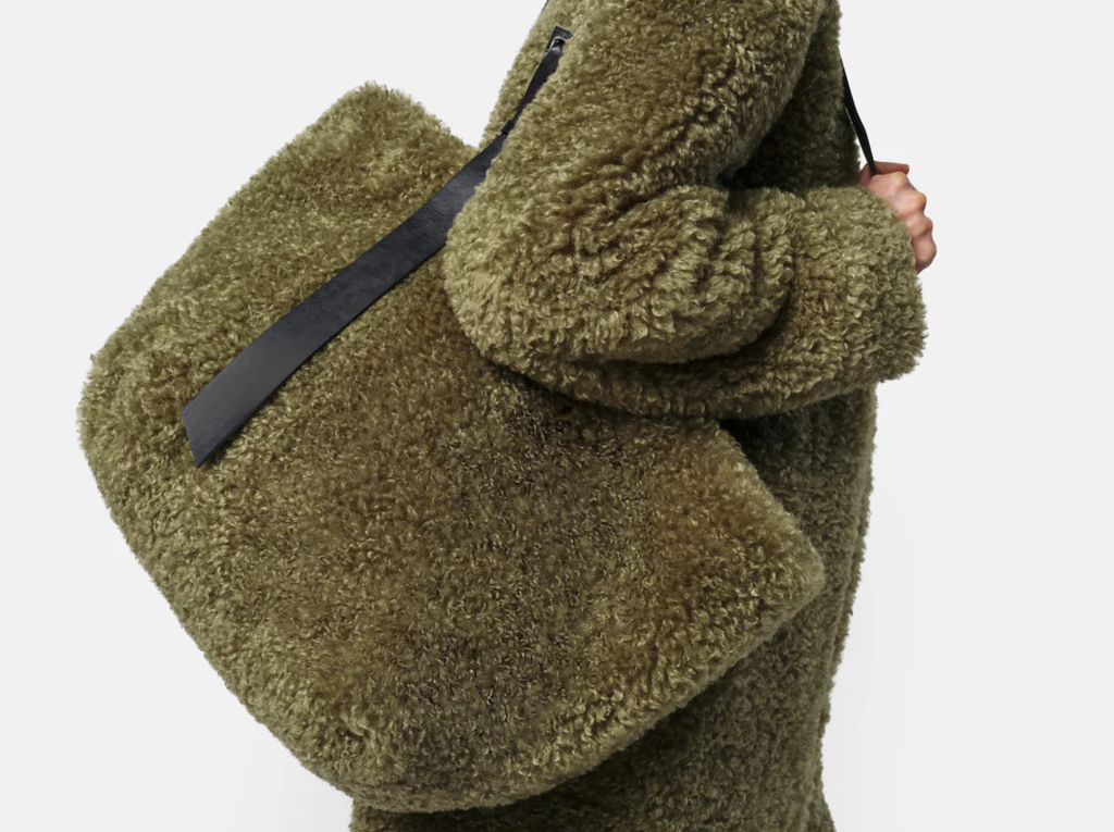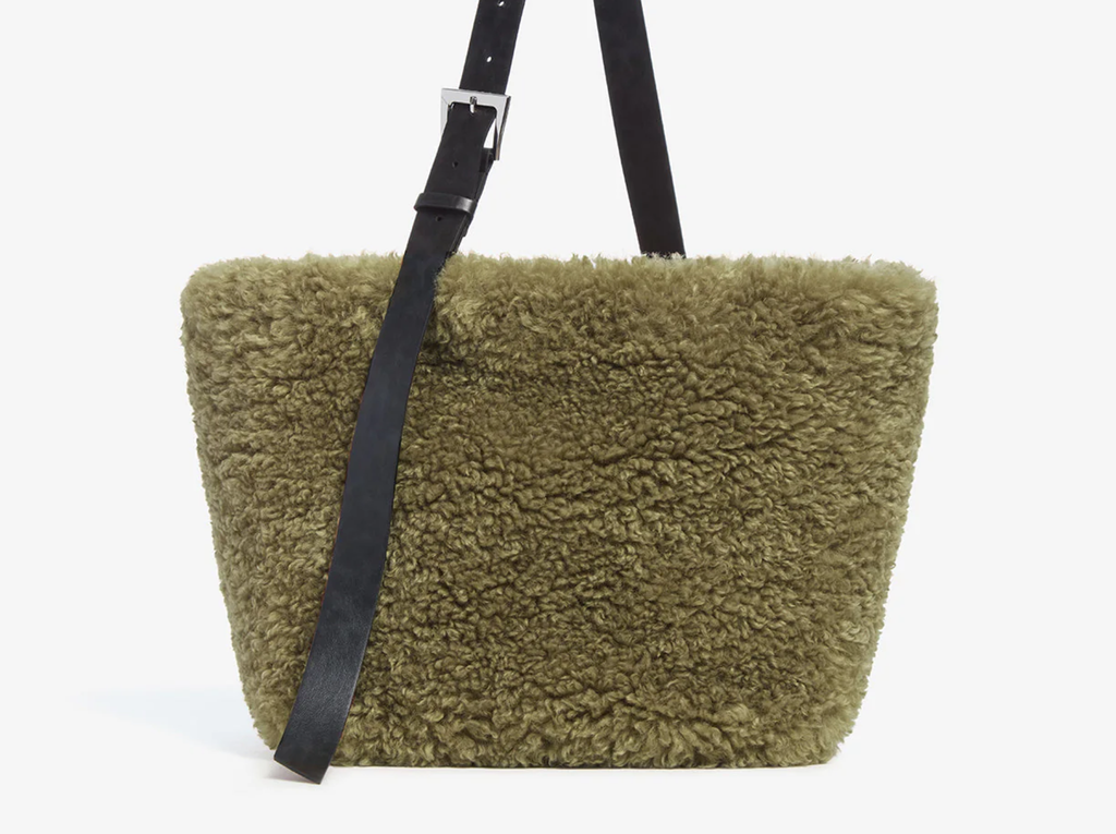 Ultra-soft BOUCLETTE faux shearling with bonded faux suede lining and Sans leather strap.